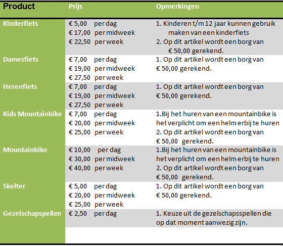 Hieronder kunt u de prijslijst en verhuur mogelijkheden bekijken.